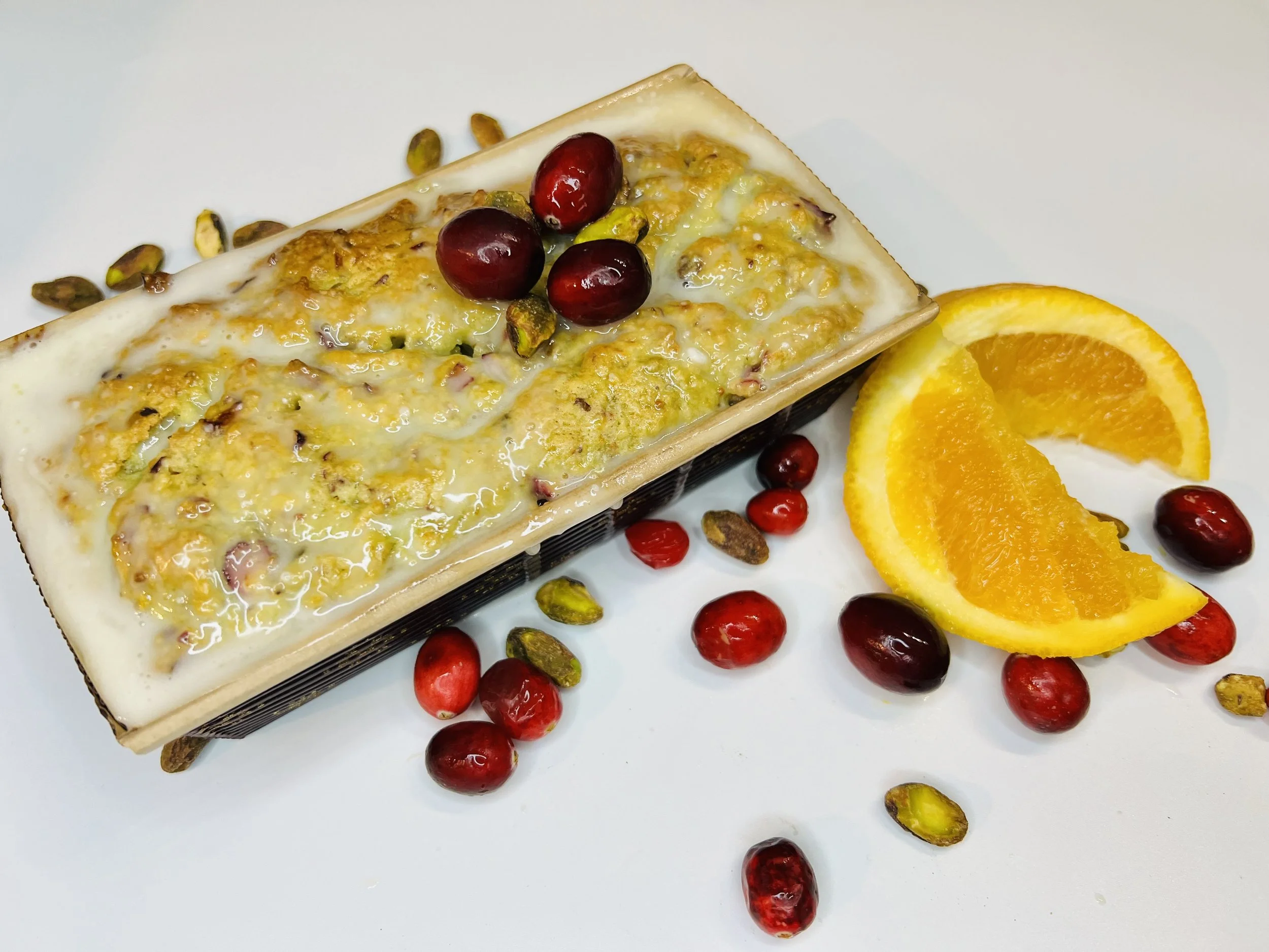 This is so goooooood!!!!! This yummy loaf is full of cranberries, roasted pistachios, orange, and covered in a sweet orange glaze. It is tasty at room temperature or heated in the oven for Breakfast!